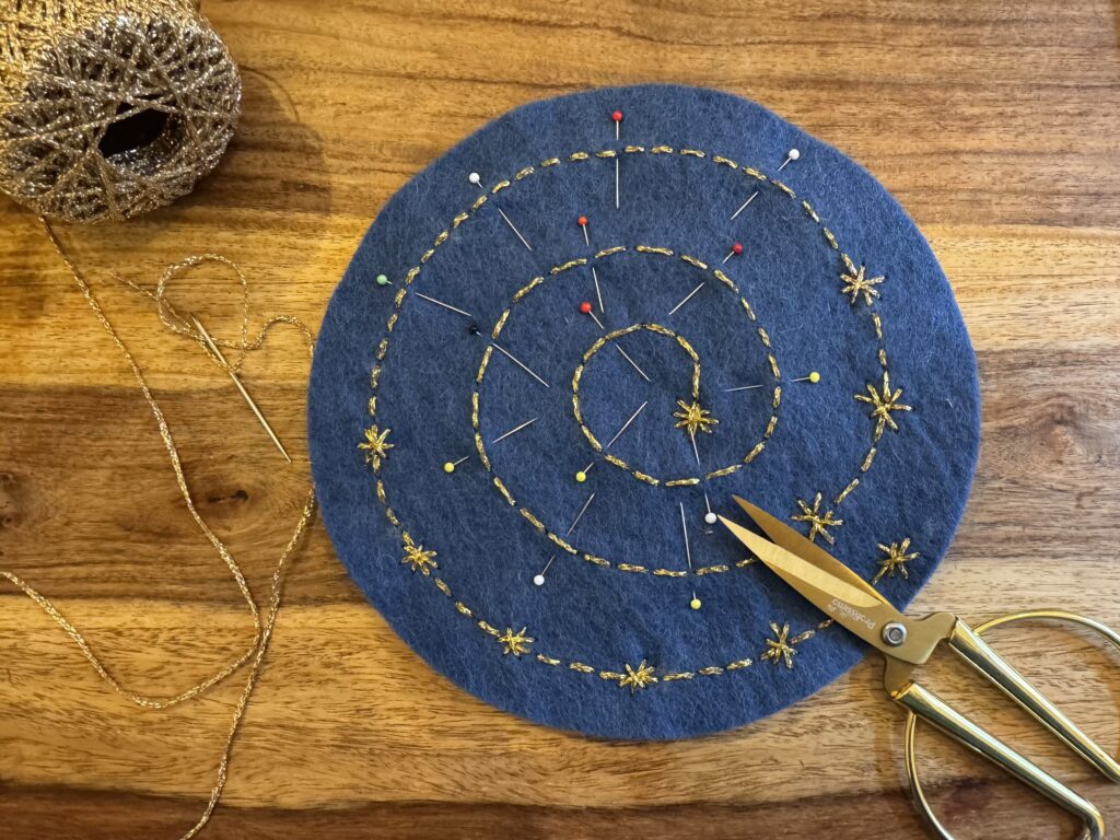 Schneide aus dem Filz eine großzügige Spirale – sie darf gern unperfekt sein, denn gerade der handgemachte Charakter macht sie so besonders. Zeichne die Spirale mit einem Stift auf dem Filzstück vor und sticke mit dem Glitzergarn die Spirale entlang. Nun setzt du am einfachsten mit ein paar Stecknadeln 24 gleichmäßige Punkte, an denen du jedes Mal ein kleines Sternchen aufstickst. Und schon ist deine Adventsspirale fertig.